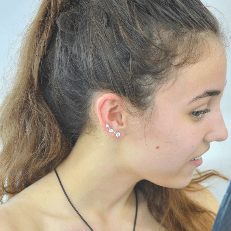 An Earslide easily threads through the piercing and crawls up along the ear & locks in place. It's like wearing a bobby pin, except, you wouldn't do that.